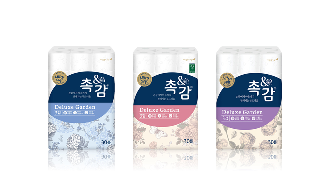이를 시각적으로 표현하는 ‘촉&감’의 브랜드 로고는 티슈가 가질 수 있는 가장 부드럽고 섬세한 촉감을 나타내기 위하여 민들레 홀씨의 이미지와 결합하였고, 로고타입은 손끝에 닿는 감촉을 표현하기 위한 부드러운 곡선으로 개발되었다. 또한 브랜드 로고가 적용되는 롤티슈, 페이셜 티슈, 키친타올 등 다양한 제품 환경에서 일관된 톤앤매너를 보여주고 시각적 임팩트를 극대화 하기 위한 패키지 디자인 시스템을 개발, 제품별 다양한 그래픽과 어우러질 때 시너지 효과를 내도록 하여 ‘촉&감’만의 차별화된 부드러움과 프리미엄 감성을 느낄 수 있도록 하였다.
